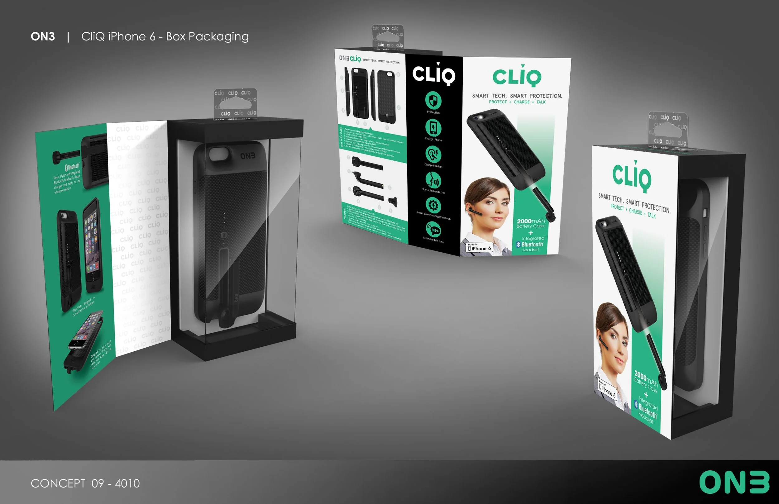 After cost analysis with manufacturing partners, it was deemed too expensive and not as easily recyclable, hence the shift to a corrugate design with molded paper pulp tray to hold phone case inside box with clear plastic window. Using a hinged flap allows more graphics/messaging space than a standard closed box, while allowing the user the ability to look at the physical product without removing it from the box. The BT headset is suspended with a crystal clear injected plastic holder to give the illusion of it floating in space next to the case.