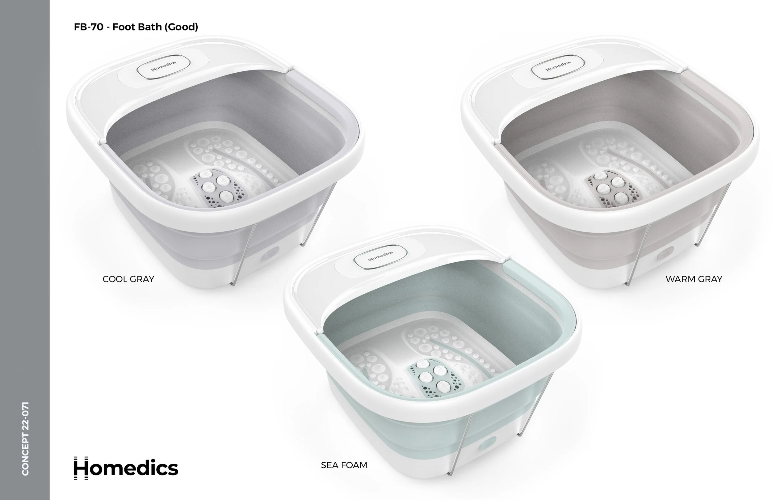 By varying the application of CMF (Color, Material, Finish) to the different designs, Homedics could have their own online exclusive model for each SKU, while still providing exclusives to different brick and mortar, and online vendors. The OPP (opening price point) model has a simple fixed splash guard and fixed massage rollers in the basin. The MPP (mid price point) model has a splash guard with integrated attachment storage, premium basin with warming and bubble generators and breathable mesh storage bag. The PPP (premium price point) model has a wireless remote that nests into the top of the splash door, accessory storage, and the same premium basin features and storage bag as the MPP model.